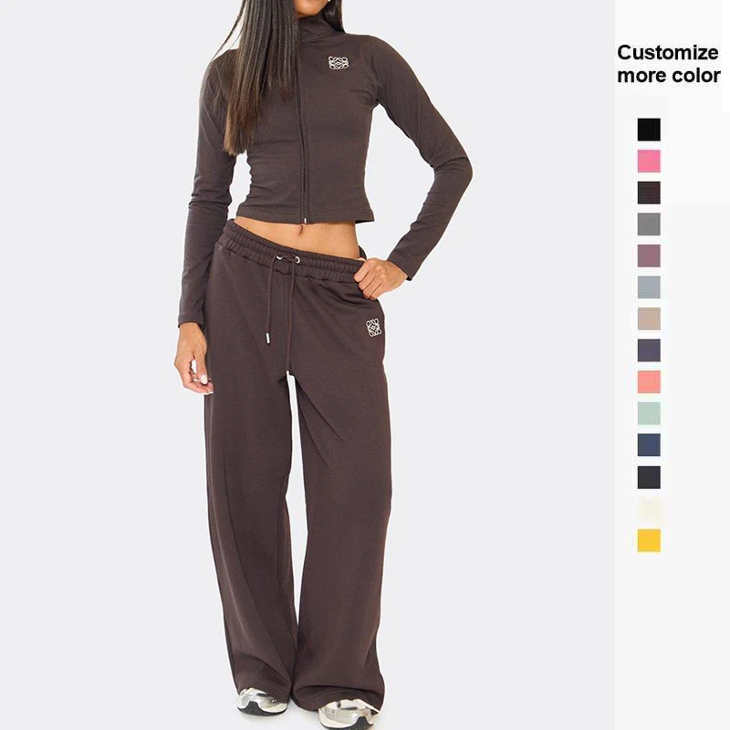 Women's Cotton 2-Piece Set for Winter Sports Warm Jogger Sportswear Long Sleeve Embroidered Zip up Jacket Tracksuit